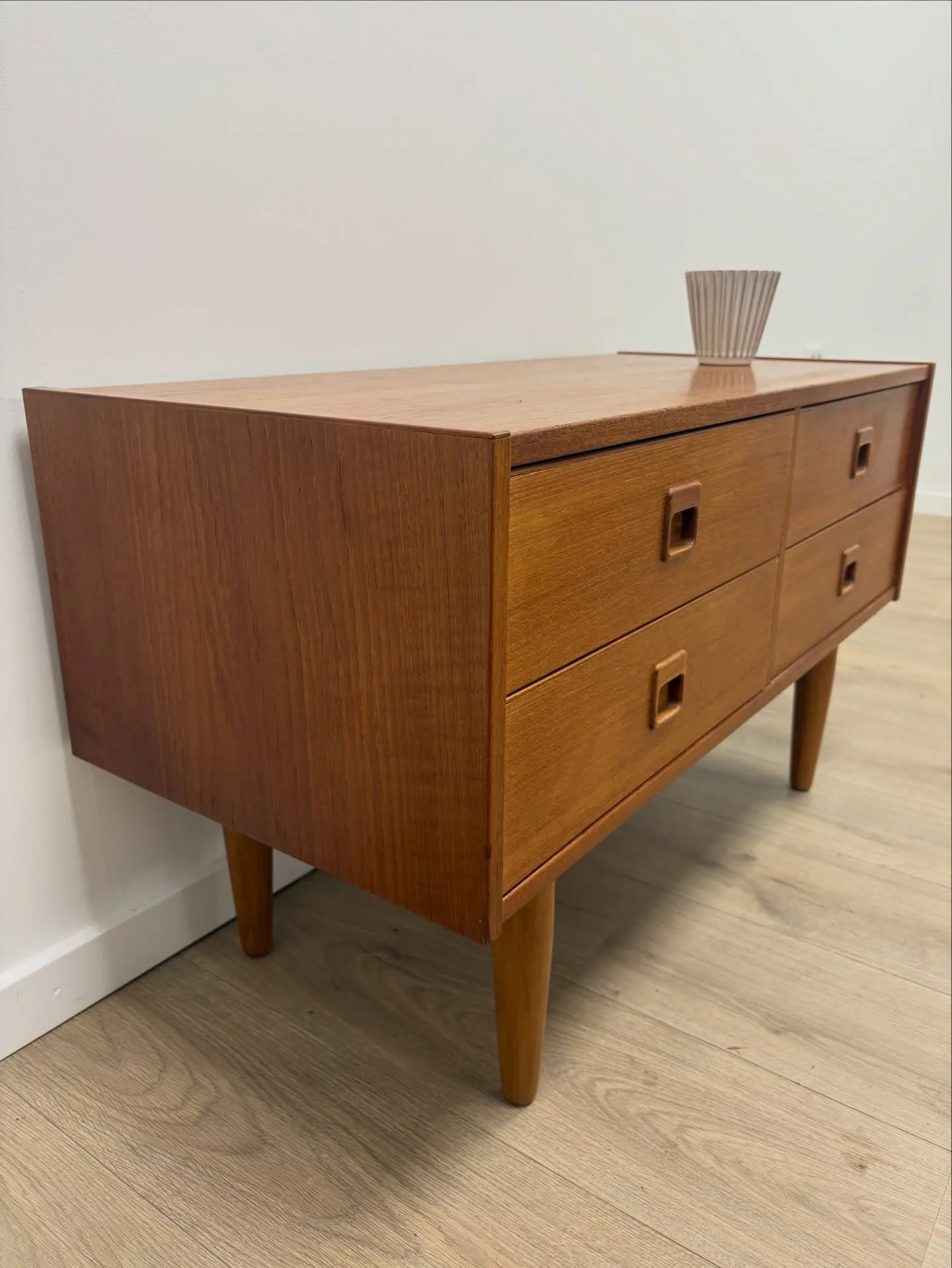 Teak kommode 4 skuffer, runde tilspidsede ben. Fin st…
