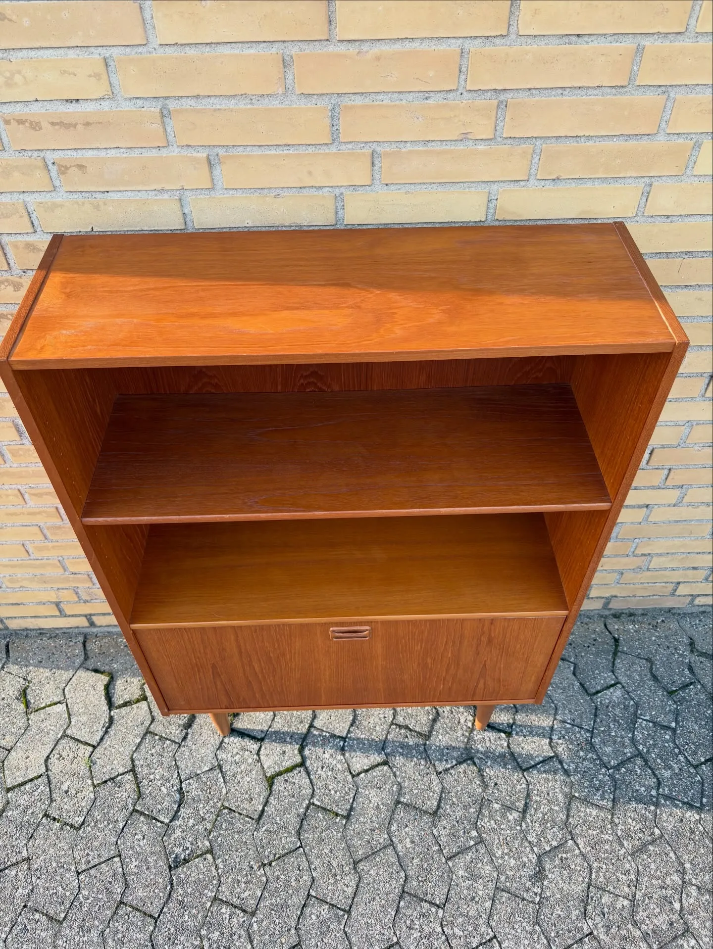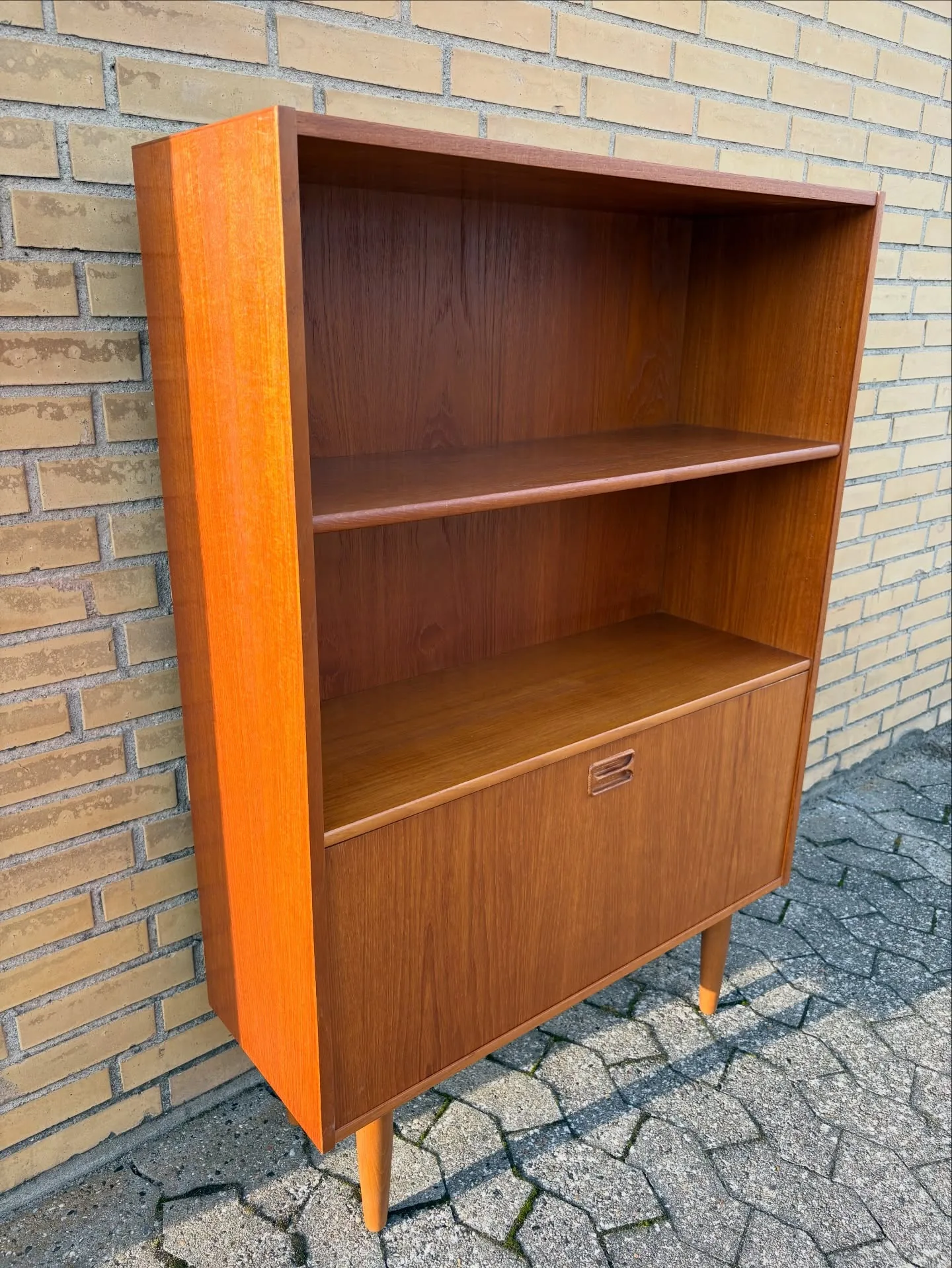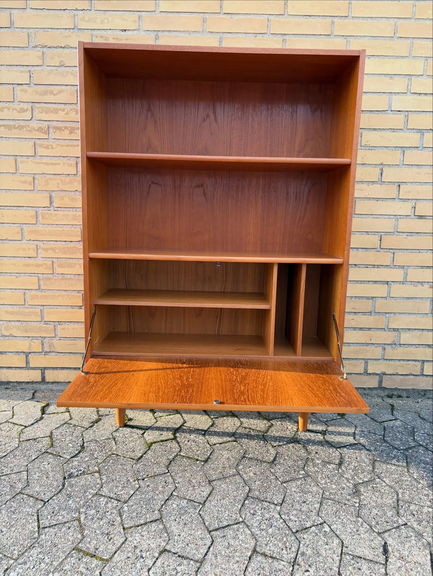 Teak reol. Hylder, låge hvor bag indeling og hylde. M…