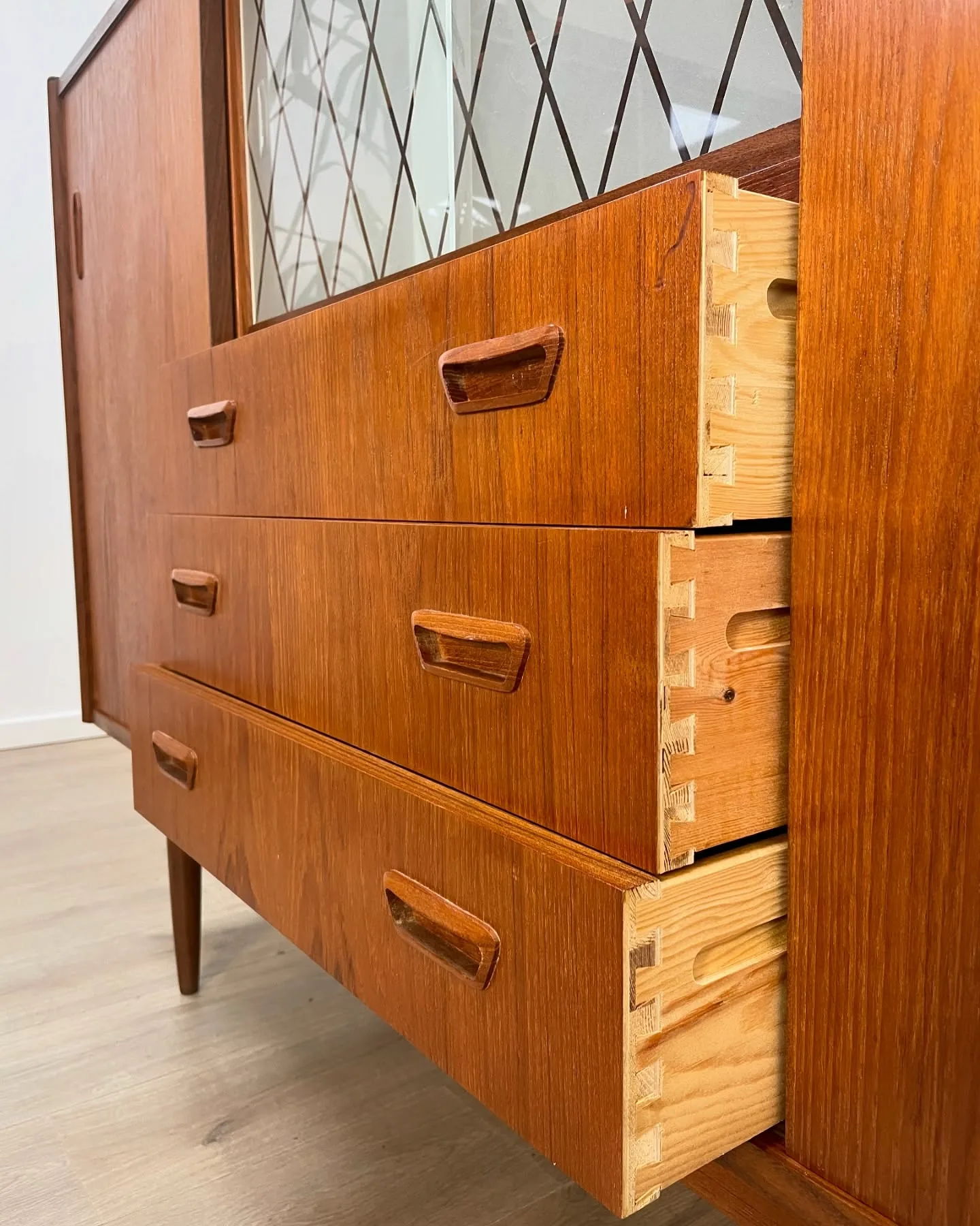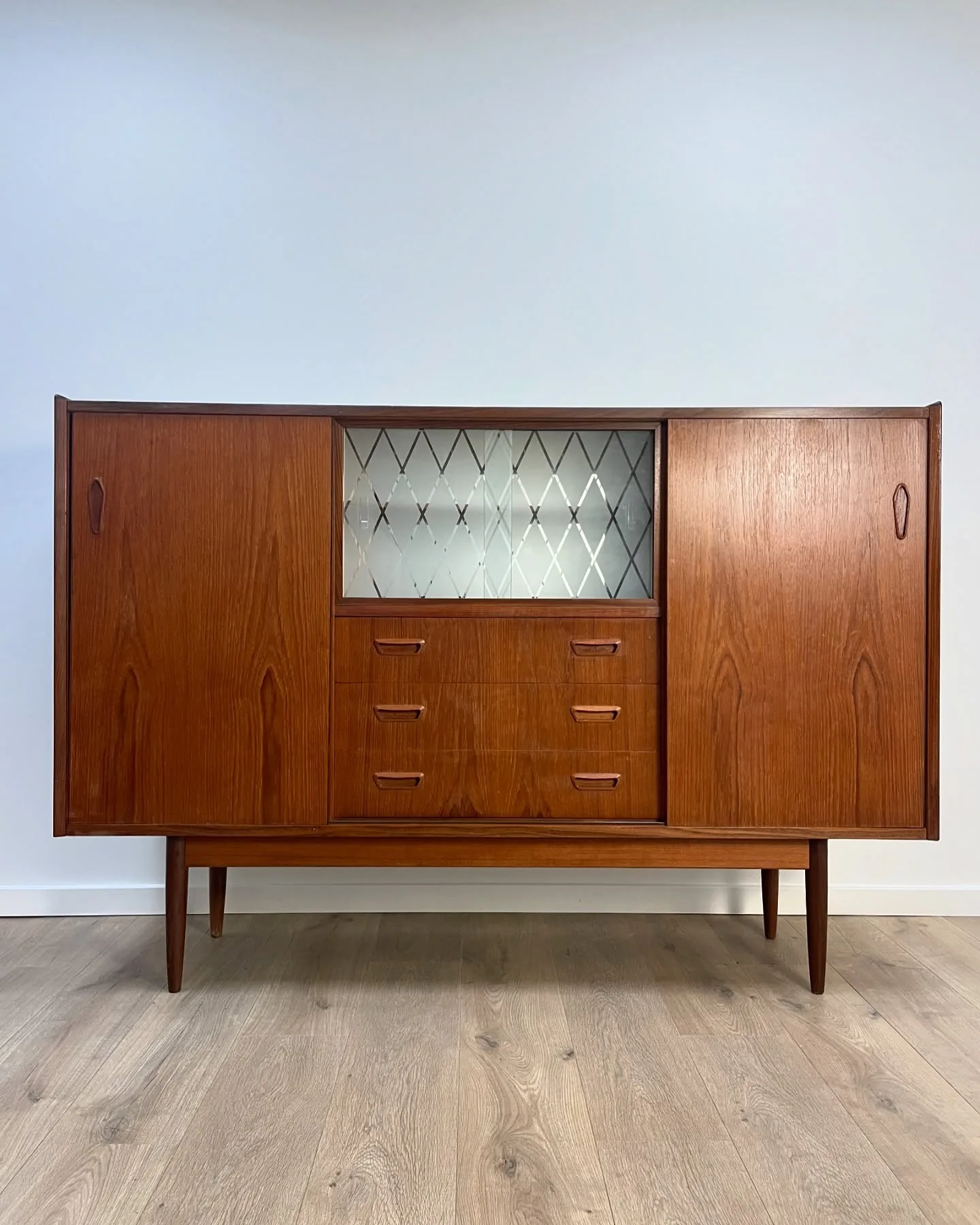 Teak skænk Skydelåger hvor bag hylder og skuffer. Gla…