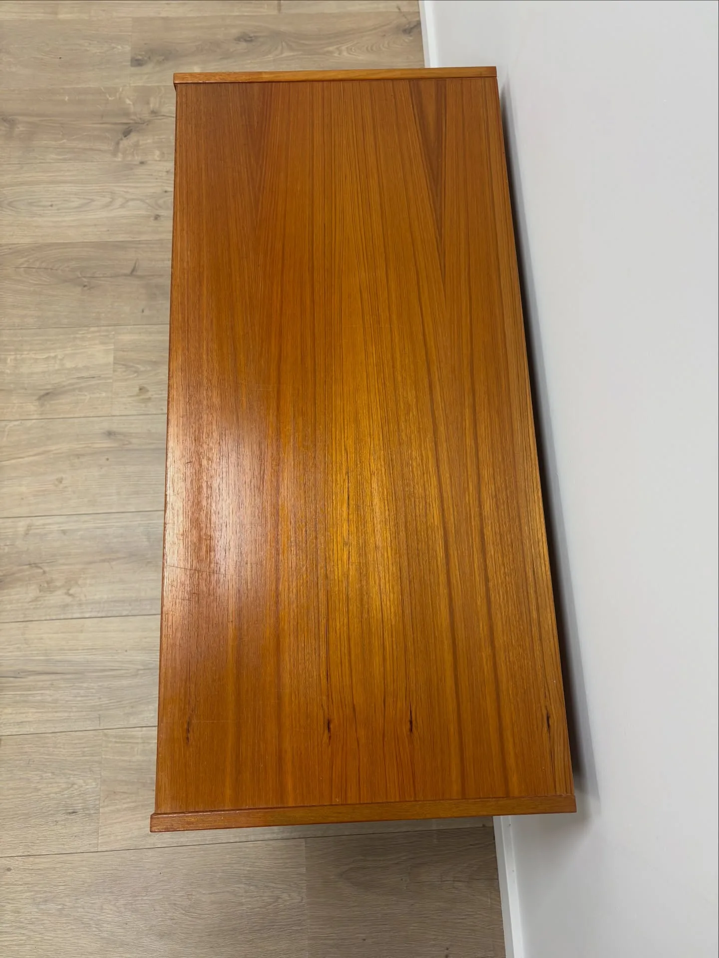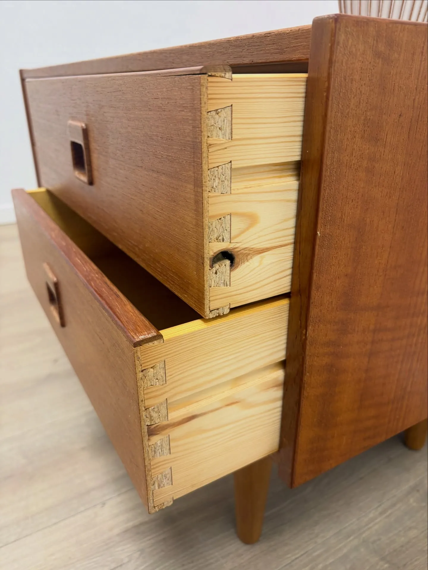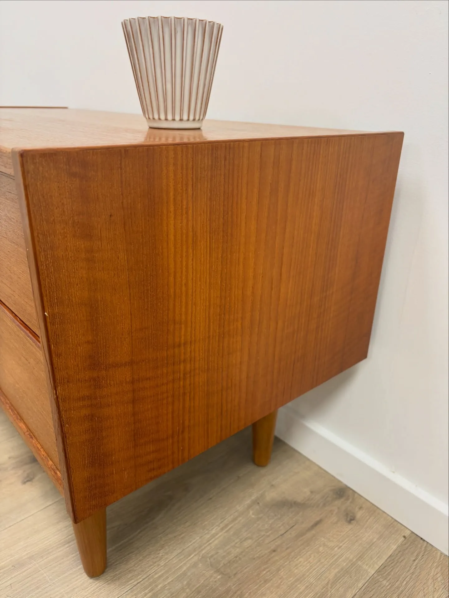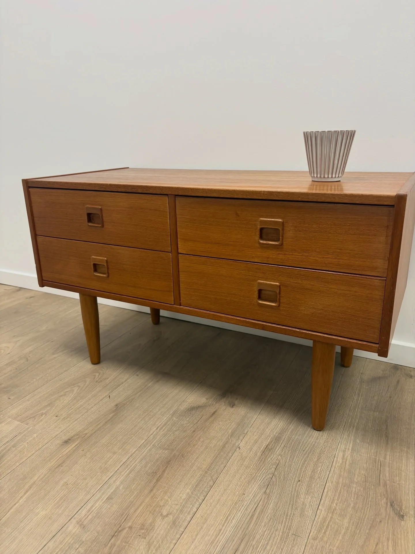 Teak kommode 4 skuffer, runde tilspidsede ben. Fin st…