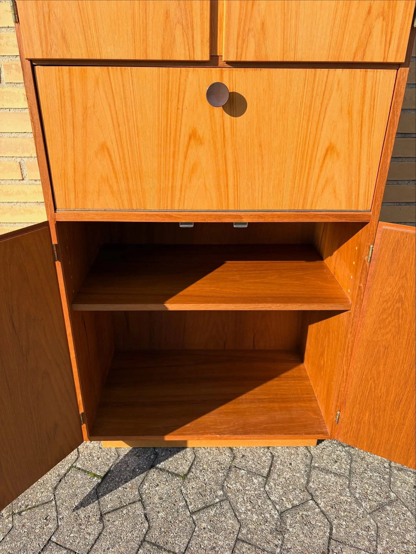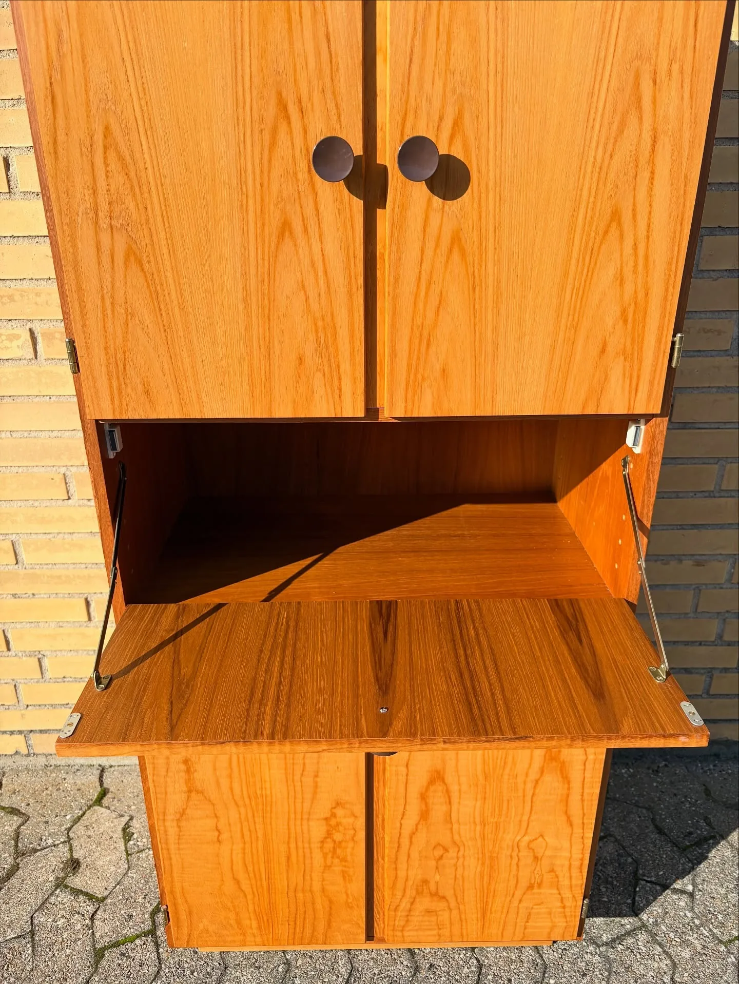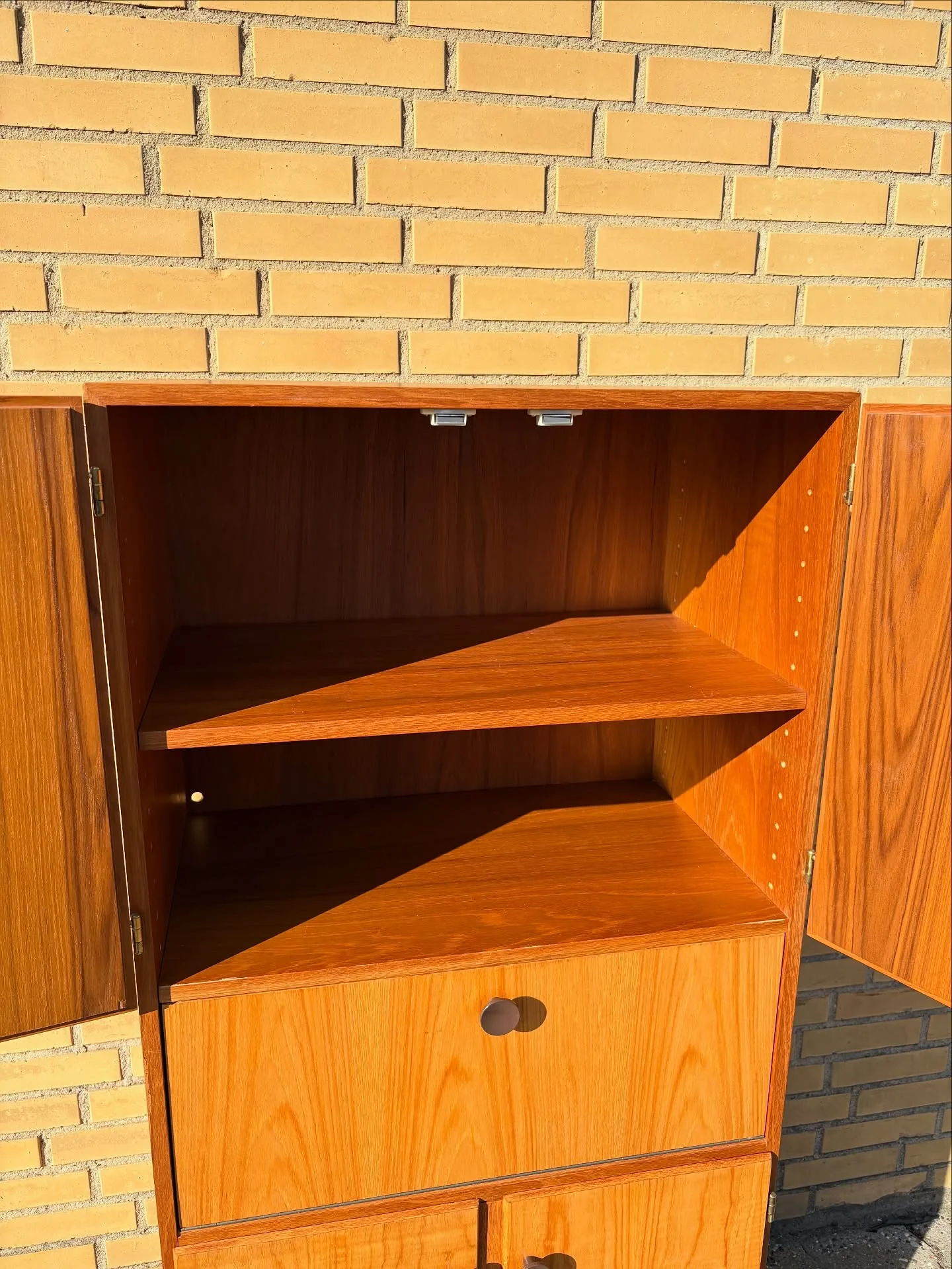 Teak skab. Låger hvor bag hylder, samt nedfældelig lå…