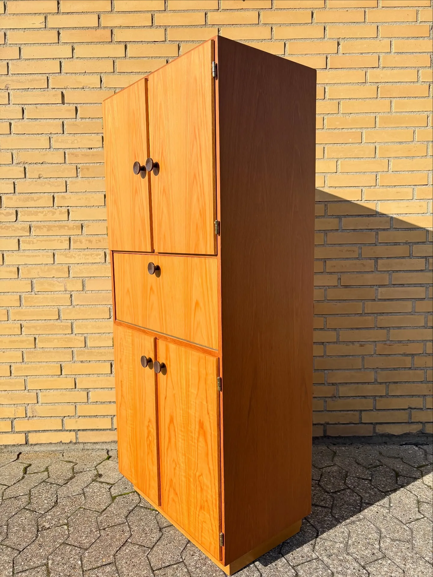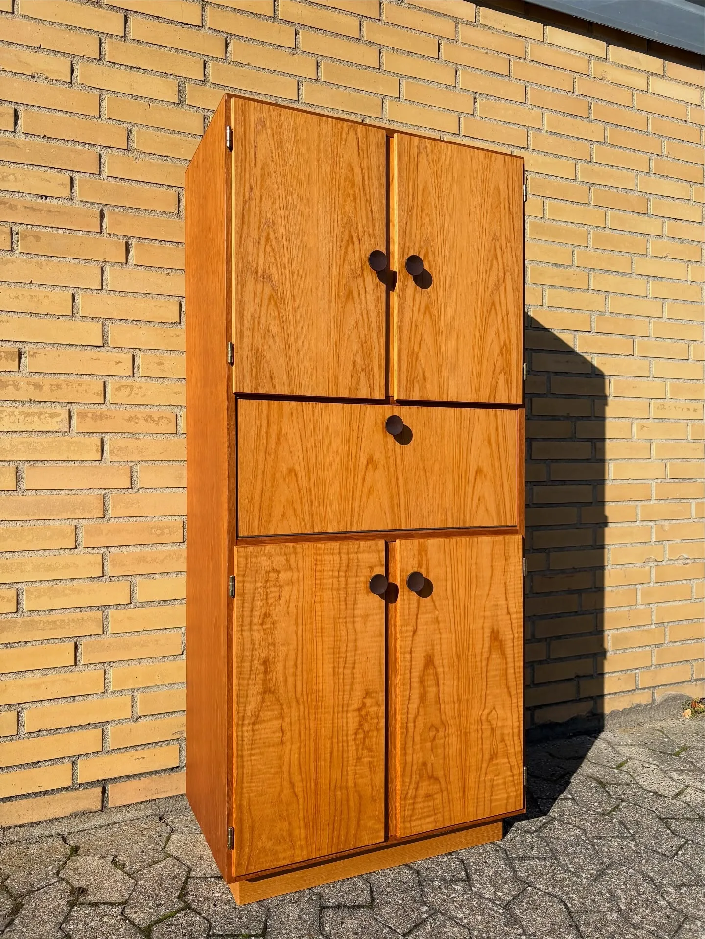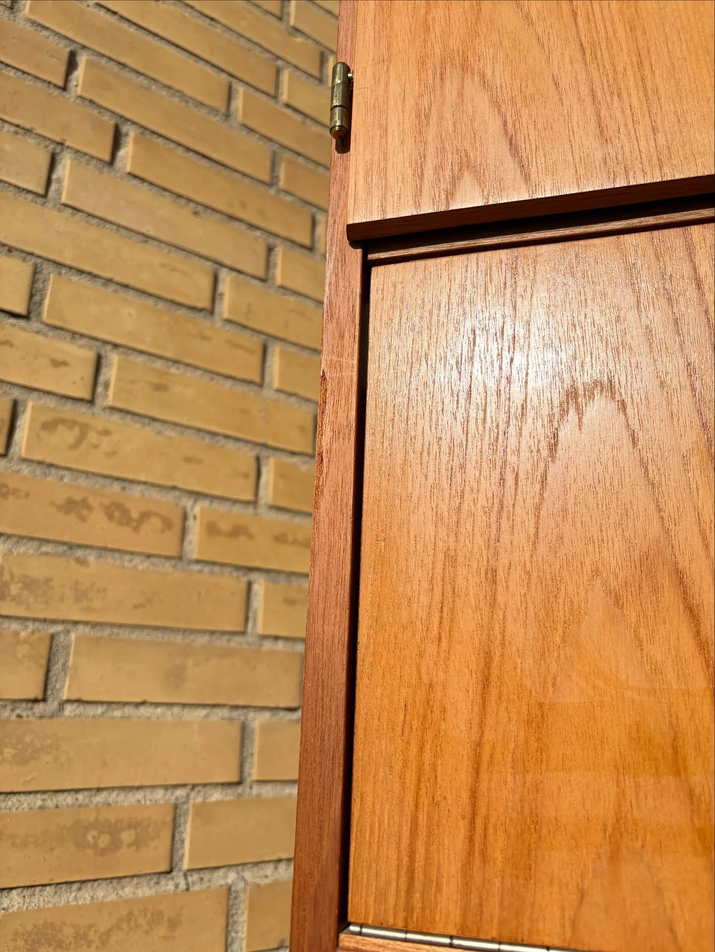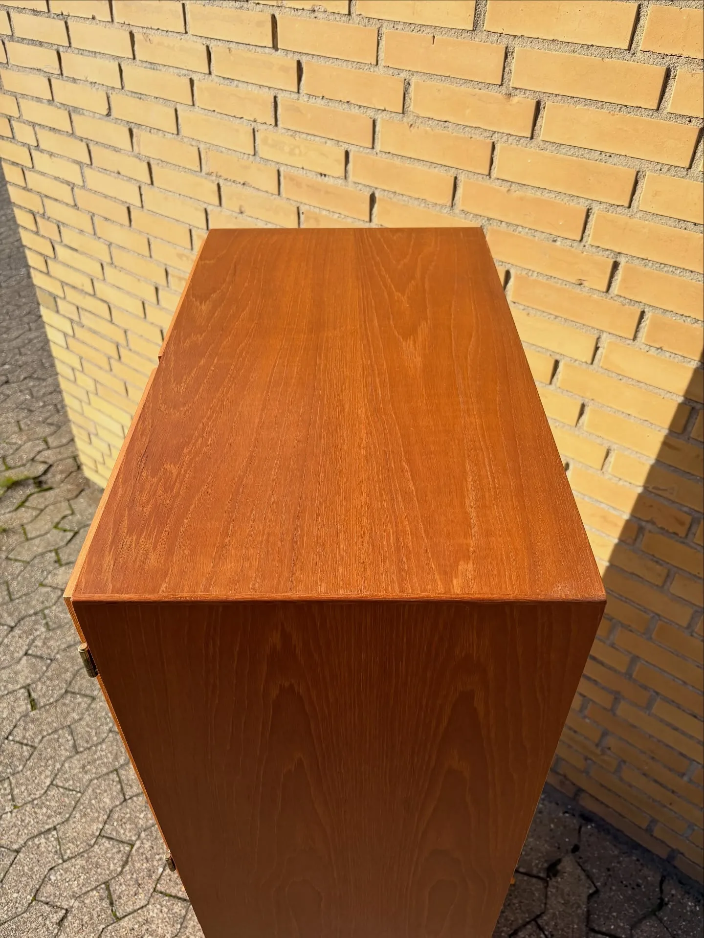 Teak skab. Låger hvor bag hylder, samt nedfældelig lå…