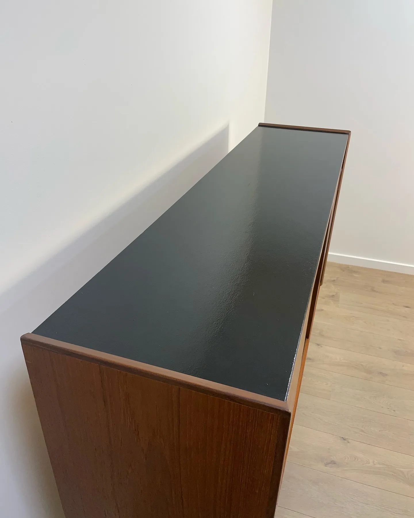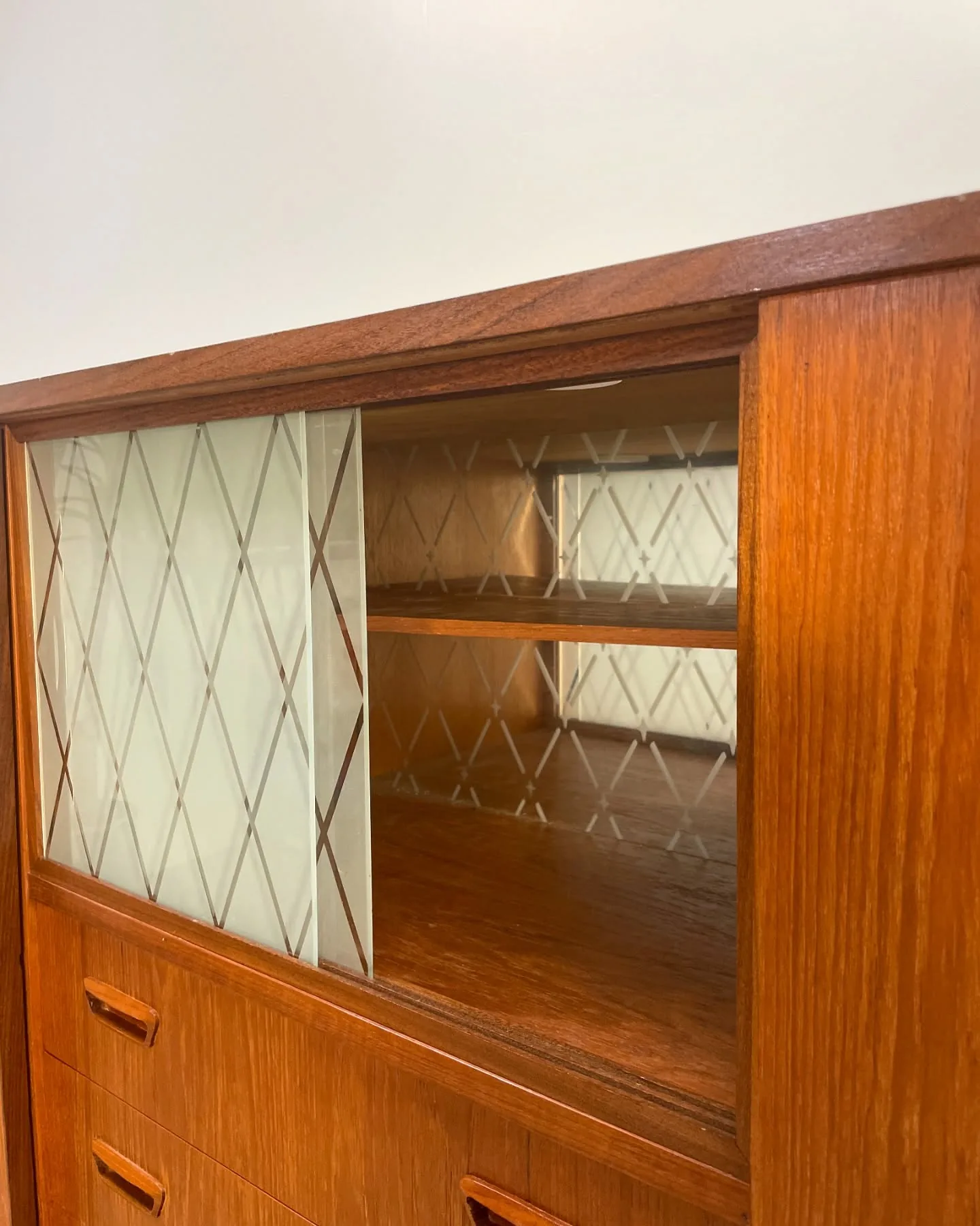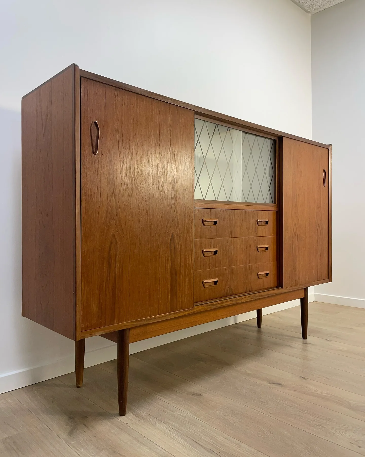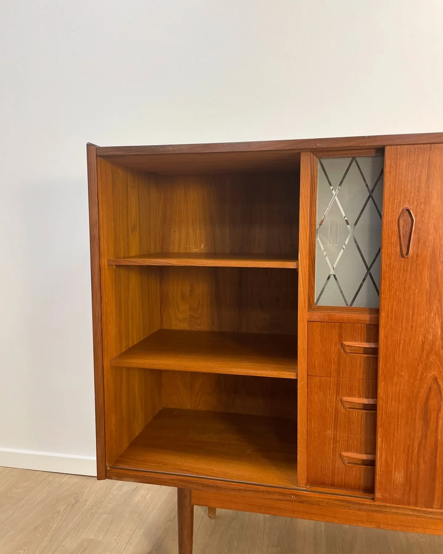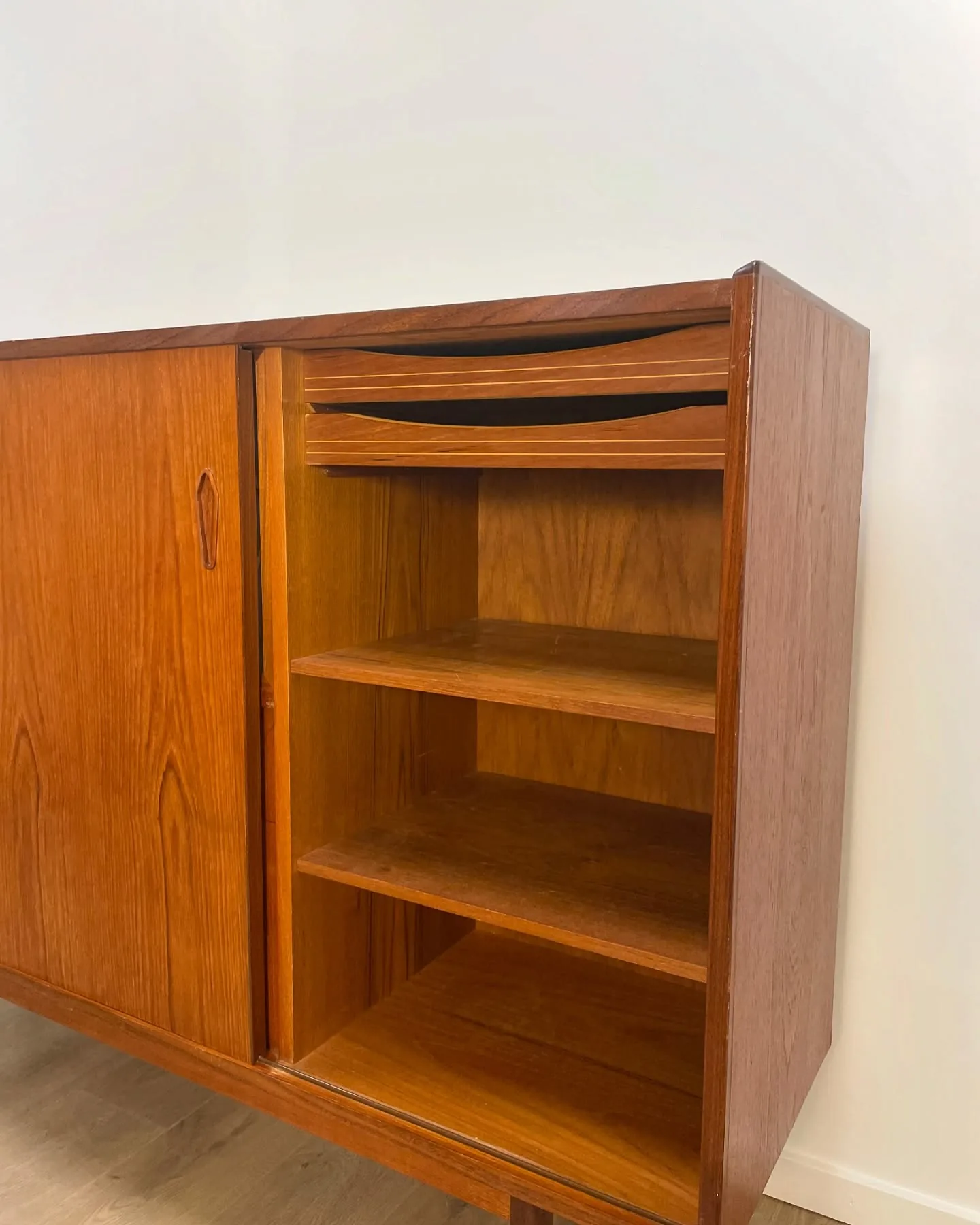 Teak skænk Skydelåger hvor bag hylder og skuffer. Gla…